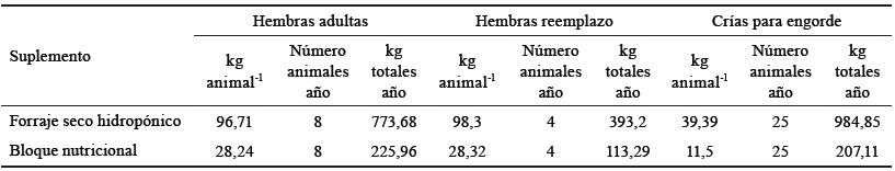 El macho no consumió suplemento, pues cubrió su requerimiento con el pastoreo. Por lo tanto, la demanda total anual de suplemento ascendió a 2 151,74 y 320,40 kg de FSH y bloque, respectivamente. Esta demanda se correspondió con los 2 159,84 kg FSH anuales obtenidos en la casa de cultivo. El bloque de 75 kg tuvo un valor comercial en el mercado de Santa Elena de 164,00 USD, lo que representó para la alimentación un costo total anual de 709,68 USD.