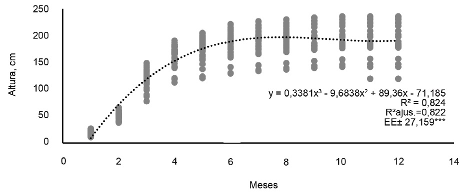 En la variedad Señorita, el modelo que explicó con mayor bondad de ajuste esta relación fue la ecuación polinómica de tercer orden, con coeficiente R² = 0,824*** y R2 ajustado= 0,822***.