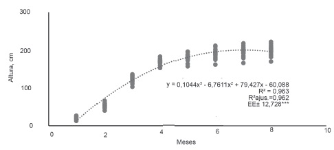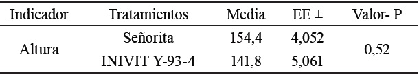 Análisis estadístico. Los datos se procesaron mediante el paquete estadístico SPSS ® , versión 22.0 para Windows. La comparación se hizo mediante inferencia muestral para dos muestras independientes, a partir de una prueba T-student, con nivel de significación de p < 0,05. Se utilizó el análisis de correlación y regresión para conocer la interrelación entre la variable altura y los días de siembra. Como norma de selección de la ecuación de mejor ajuste, se tomó en consideración, entre los criterios de Guerra et al. (2003), que el coeficiente de determinación (R2) real y ajustado fuera mayor que 0,70. Además, se consideró el nivel de significación.
