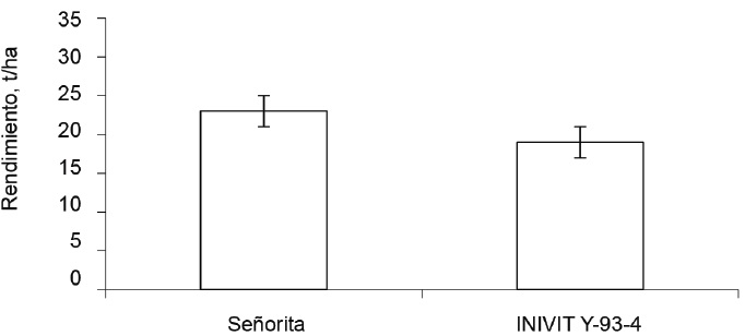 La figura 3 muestra el rendimiento agrícola de ambas variedades. La variedad Señorita alcanzó mayor valor (23 t/ha), y estuvo por encima de la media nacional informada para este cultivo (19 t/ha) según informes de Beovides et al. (2013). INIVIT Y-93-4 mostró un rendimiento similar a la media nacional.
