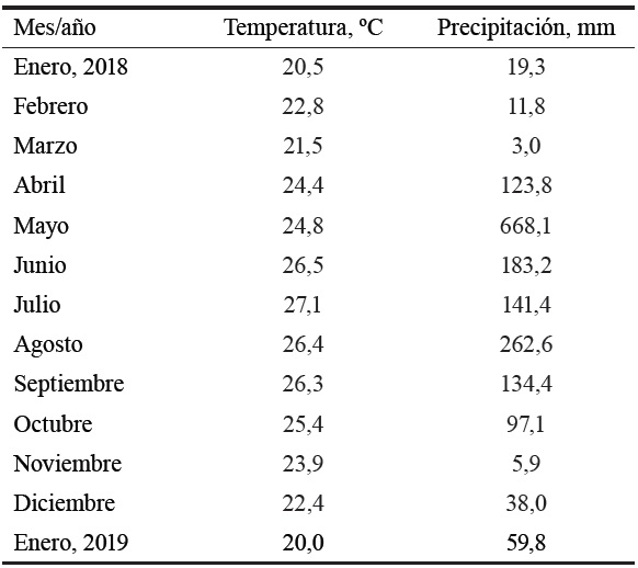 Clima y suelo. Los datos de precipitaciones y temperatura se tomaron de la Estación de Meteorología ubicada en los predios de la Institución (tabla 1). Los valores registrados se encuentran en los rangos normales de estas variables para los meses en los que se desarrolló la investigación. El estudio se llevó a cabo sobre un suelo ferralítico rojo (Hernández-Jiménez et al., 2015).