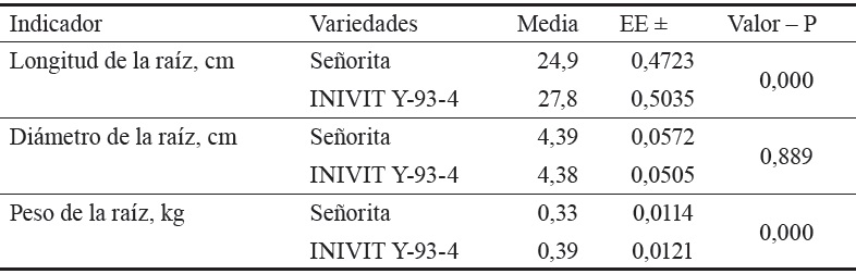 En la tabla 3 se muestran los indicadores morfológicos de las raíces por variedad. Se encontraron diferencias estadísticas significativas en la longitud y el peso de las raíces (p < 0,001). La variedad INIVIT Y-93-4 mostró mayor longitud y peso de las raíces. Sin embargo, no se encontraron diferencias significativas en el diámetro de las raíces, cuyos valores fueron de 4,38 y 4,39 para Señorita y INIVIT Y-93-4, respectivamente.