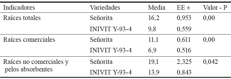 En la tabla 4se muestra la cantidad de raíces totales, comerciales y pelos absorbentes por variedad. La variedad Señorita difirió estadísticamente en las variables número de raíces totales, número de raíces comerciales (p < 0,001) y pelos absorbentes (p < 0,05).