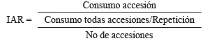 Variables evaluadas. Para cada asociación se evaluó la aceptación con novillas Holstein (300 kg de peso promedio) en 12 parcelas y se estimó el índice de aceptabilidad relativa (IAR) utilizado por Maass et al. (1999). Para ello se realizaron observaciones cada cinco minutos, entre las 8:30 a.m. y 3:30 p.m., durante dos días en cada repetición. Se concibió la primera como acostumbramiento. Con el resultado de las observaciones se calculó el IAR para cada accesión, dividiendo la frecuencia de pastoreo observada en cada accesión especifica por el total de las frecuencias de pastoreo, relativo al total de accesiones incluidas. Esto es:
