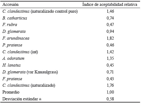 Para las 12 parcelas, al rebrote de 45 días, el IAR varió de 0,43 a 1,82 entre asociaciones, y sobresalieron F. arundinacea (1,82) y C. clandestinus (1,76), siendo altamente aceptables estas asociaciones, no fue así para 50 % de ellas (IAR < 1,0). Las asociaciones de menor aceptabilidad fueron F. pratense, H. lanatus y P. pratense, con valores de 0,43; 0,45 y 0,46, respectivamente (tabla 1). Esto se puede asociar a la alta proporción de leguminosa en estas asociaciones.