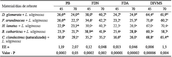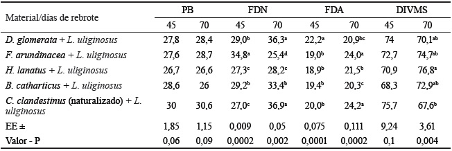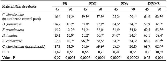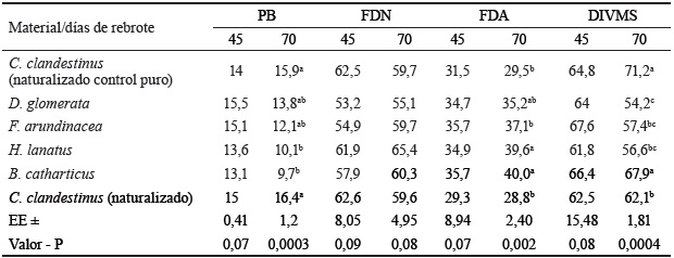 Se destaca entre todas las gramíneas, el contenido de PB en el C. clandestinus (naturalizado) a los 45 y 70 días de rebrote, con 17,3 y 14,3 % respectivamente (tabla 2). Sin embargo, Portillo-López et al. (2019) refirieron valores superiores, con contenido de PB de 23,3 % en la localidad de Pasto y 18,7 % en Sapuyes, Nariño, Colombia, en época de altas precipitaciones. Jaime (2002) informó para C. clandestinus, a 45 días de rebrote, 21,5 % de PB, valor más alto que el registrado en el presente estudio.