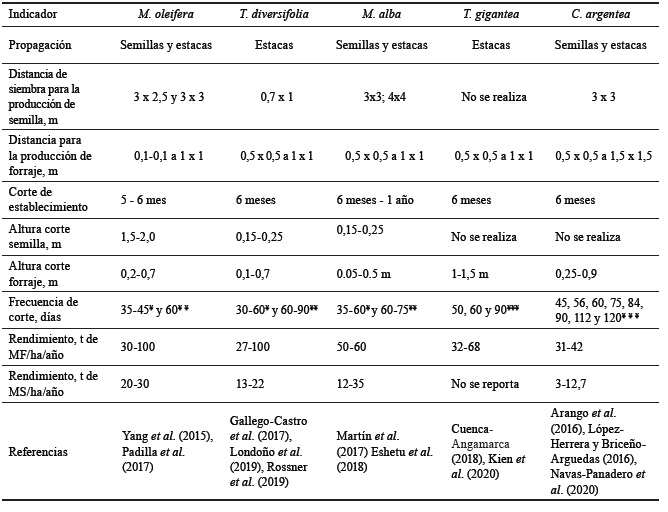 Results: There is variability in the management, processing and conservation conditions of the forage of M. oleifera, T. diversifolia, M. alba, T. gigantea and C. argentea. Their crude protein contents oscillate between 13 and 33 %. They are sown in densities between 555 and 1 000 000 plants/ha. The yield varies from 3 to 35 t DM/ha/year, and they are abundant during the dry season. With these species between 5 and 7 kg milk/animal/day can be obtained and the animal weight gain can exceed 500 g/animal/day.