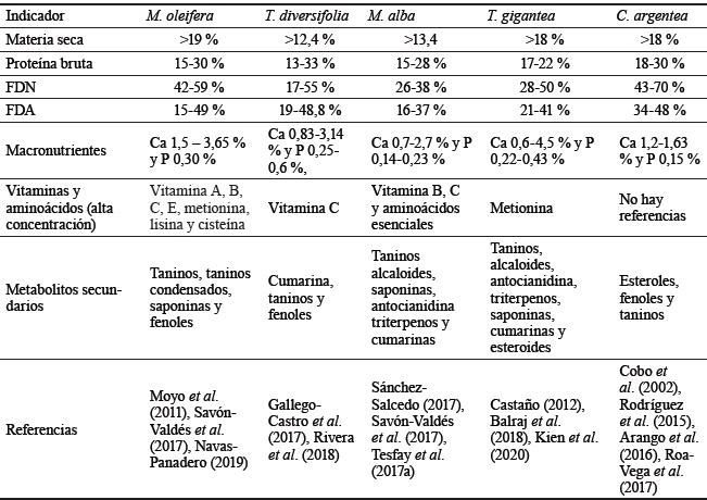 En la tabla 2 se presenta la composición química de M. alba, T. diversifolia, M. alba, T. gigantea y C. argentea. Se debe considerar que los resultados aquí reflejados son meramente referenciales y evidencian una amplia variabilidad, según las condiciones en que se registraron los datos, por lo que es posible que cambie la concentración, aparición y detección de cualquiera de los componentes en el transcurso de las investigaciones y según los sistemas productivos.