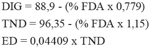 En cuanto al TND, se registraron valores entre 47,8 y 57,7 % para T1 y T3, respectivamente. El valor del TND del T3 fue superior al promedio de un silaje de alfalfa, según lo referido por Gallardo (2015). La ED alcanzó cifras entre 2,1 y 2,5 Mcal/kg de MS para T1 y T3, respectivamente. Los contenidos de TND y ED se incrementaron significativamente, en proporción directa con el incremento del contenido de hojas de M. esculenta en la mezcla ensilada.
