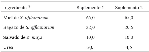 Consumo y manejo del suplemento. Antes de la elaboración del suplemento se realizó un balance nutricional. Para ello se tuvo en cuenta el aporte del forraje consumido y los requerimientos nutricionales de los animales, según la NRC (2001). Se suponía que el déficit se debía cubrir con el suministro de dos suplementos, basados en miel y bagazo, como subproductos de S. officinarum panelera y fuente energética para los bovinos; los suplementos incluyeron además, salvado de Zea mays L. y dos inclusiones de urea, de acuerdo con Garríz y López (2002).