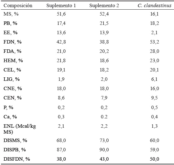 Los CNE de ambos suplementos fueron numéricamente superiores a los de la pastura (18 vs 16 %). Villalobos y Sánchez (2010) plantearon que la proporción de CNE es inversamente proporcional al contenido de fibra y a la digestibilidad de la MS. A su vez, está relacionada con la energía de alta disponibilidad en la dieta y la eficiencia de utilización de la proteína degradable (Castro-Rincón et al., 2019). Estos criterios son coincidentes con lo observado en este estudio, en el que los suplementos tuvieron mayor contenido de CNE y DISMS, pero menor valor de FDN, con respecto a C. clandestinus.