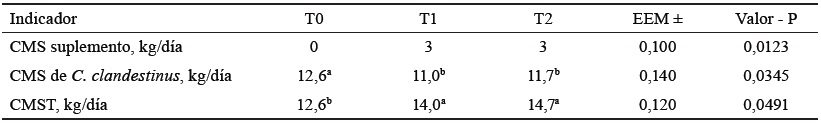 En cuanto al consumo de los suplementos (tabla 4), se consumieron los 3 kg de MS/animal/día ofrecidos. Para autores como Castaño et al. (2012), el consumo de suplementos que contengan subproductos de S. officinarum depende de los niveles de inclusión, la composición y la forma de suministro. Se observó que el consumo de C. clandestinus fue superior (p < 0,05) para los animales que no fueron suplementados (T0), que consumieron 1,6 y 0,9 kg de MS más, comparados con los del T1 y T2. Sin embargo, al observar el CMST diario, se pudo ver que los animales en los tratamientos que incluyeron los suplementos consumieron más MST/día que en el testigo (p < 0,05).