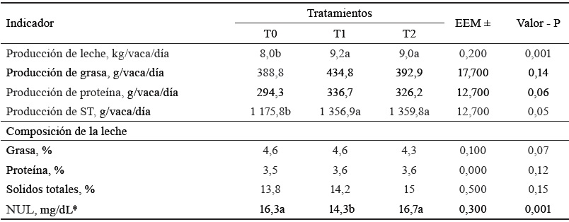 En este estudio, las vacas alimentadas con T1 alcanzaron valores de P de 3,6 %, y 14,6 mg/dL de NUL. En los tratamientos T0 y T2, con porcentajes de proteína de 3,5 y 3,6 % en la leche, los valores de NUL fueron de 16,3 y 16,7 mg/dL, respectivamente, condición que evidencia que el T1 presentó una adecuada relación proteína-energía.