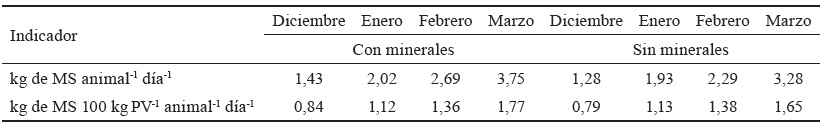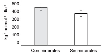 Resultados: El grupo con suplemento mineral tuvo incremento en el peso vivo de 16,3 % con respecto al que no lo recibió. Los valores fueron de 78,9 vs 66,1 kg, y la ganancia media diaria de peso fue significativa (p < 0,001) (0,438 vs 0,367 kg animal-1 día-1, respectivamente). El consumo promedio diario de la sal mineral presentó variaciones significativas (p < 0,001) entre los meses (entre 29,0 y 48,8 g animal-1 día-1). Los balances nutricionales evidenciaron que el tratamiento sin minerales mostró déficit de Ca, P, Na, Cu y Zn.