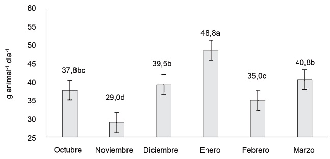 El consumo promedio diario de sal mineral presentó variaciones significativas (p < 0,001) entre los meses (figura 3), con valores entre 29,0 y 48,78 g animal-1 día-1. El mayor valor se logró en enero, y el menor en noviembre; mientras que diciembre y marzo difirieron de febrero, pero no de octubre. El promedio de consumo en este período fue de 38,4 g animal-1 día-1.