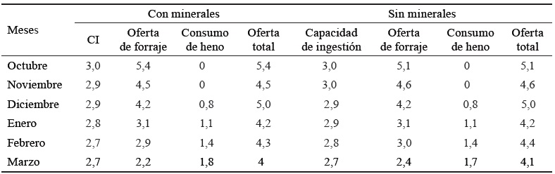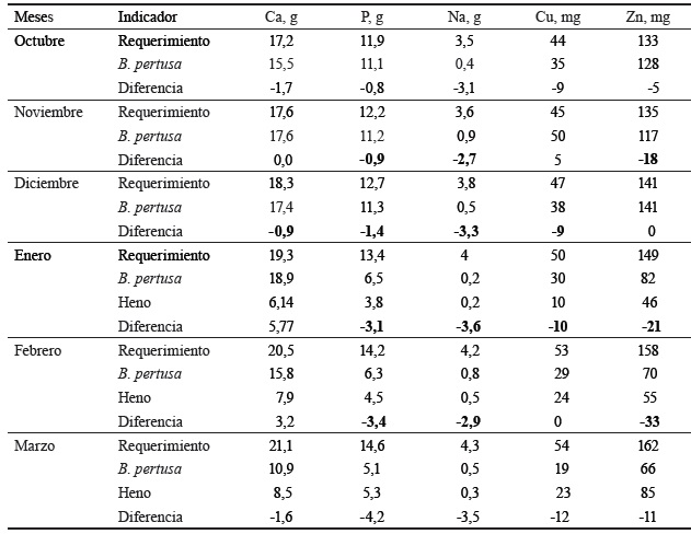 En octubre, diciembre y marzo hubo limitaciones (g animal-1 día-1) de Ca, con valores que variaron entre 0,9 y 1,7. En todos los meses hubo déficit de P (de 0,8 a 4,2) y de Na (de 2,7 a 3,6). Esta situación también se presentó en el Cu, excepto en noviembre, con valores (mg animal-1 día-1) de 9 hasta 14. En el caso del Zn, solo se cubrieron los requerimientos correspondientes a diciembre, y los rangos de limitación variaron de 5 hasta 33 mg animal-1 día-1.