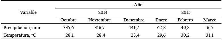 Las evaluaciones se realizaron del primero de octubre del 2014 al 30 marzo del 2015. El comportamiento de las lluvias y las temperaturas se tomó de la estación meteorológica situada en Motilonia (tabla 1).