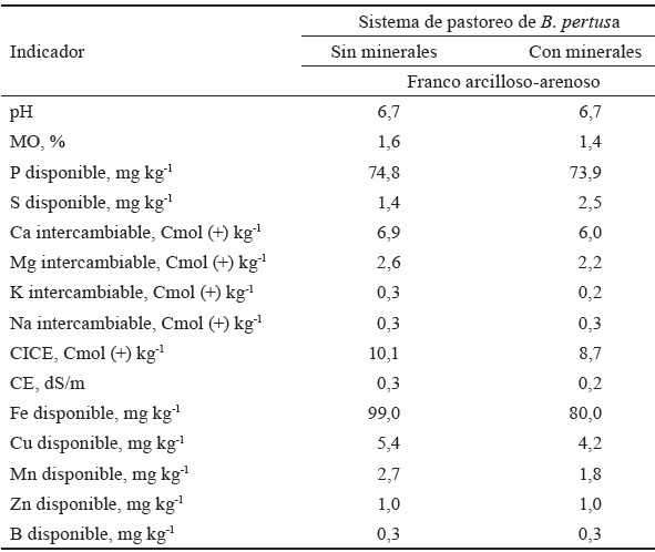 Los suelos de las áreas experimentales presentaron textura franco arcilloso-arenoso, con pH ligeramente ácido. Los contenidos de MO, Mn, S y Zn fueron bajos, con valores medios para el Mg, K, Fe, B, y altos para el P, Cu y Ca. Las concentraciones de Na se consideraron normales, lo que permitió clasificar los suelos como no salinos (McDowell, 1985).