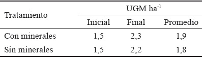 Procedimiento experimental. Cada tratamiento dispuso de dos hectáreas, subdivididas en ocho cuartones de 2 500 m2. El ciclo de rotación fue de cuatro días de ocupación y 28 de descanso, por el método de pastoreo rotacional en línea. El peso vivo (PV) de los animales se transformó a unidades de ganado mayor por hectárea (UGM ha-1), al considerar como unidad de referencia 450 kg. En proporción con el incremento de peso, la UGM ha-1 evolucionó en orden ascendente, y ratificó las acciones favorables de los minerales (tabla 3).