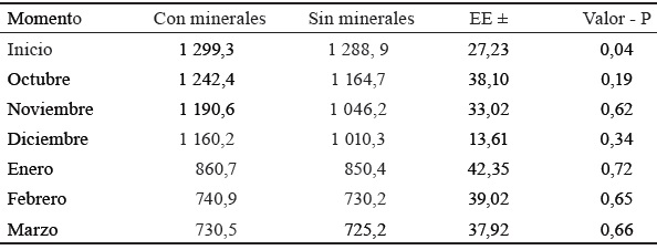La figura 1 muestra el incremento del peso vivo de los tratamientos. Al inicio, los grupos no presentaron diferencias significativas en sus valores, y mantuvieron esta condición hasta enero. Sin embargo, a partir de ese mes hubo incrementos significativos (p < 0,001), a favor del grupo con suplemento mineral.