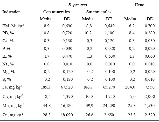 De acuerdo con los rangos sugeridos por McDowell (2017) para los pastos tropicales, B. pertusa presentó concentraciones elevadas de Ca, K y Mg, y bajas, de P y Na. En cuanto a los microelementos, el contenido de Fe fue adecuado, el de Mn elevado, el de Zn marginal, y el de Cu deficiente.