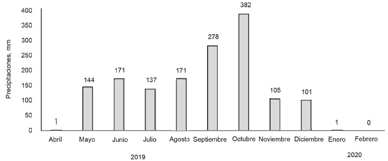 Clima del área experimental. Durante el período de investigación, la precipitación fue de 1 491 mm (medida con un pluviómetro modelo Hellmann, instalado en el predio), con los mayores acumulados en septiembre y octubre. En los meses que coinciden con la etapa poco lluviosa, prácticamente no llovió (figura 1). La temperatura promedio fue de 26 °C, con mínima de 23 °C y máxima de 30 °C. La humedad relativa promedio fue de 74 %, con mínima de 63 % y máxima de 86 %. Estos indicadores se determinaron con un termómetro digital.