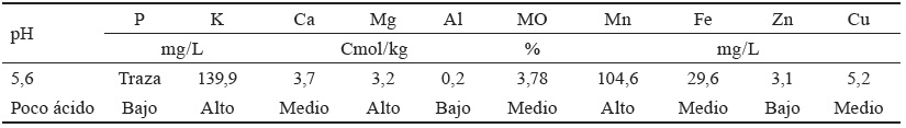 Suelo del área experimental. Los suelos de la finca son de color pardo amarillento, con textura franco arenosa (arena, 64 %; limo, 24 % y arcilla, 12 %). Presentan pH ligeramente ácido (5,6), con contenidos de materia orgánica de 3,78 %. Los resultados de su composición química, obtenidos en el Laboratorio de Fertilidad de Suelo, del Instituto de Investigaciones Agropecuarias de Panamá (Villarreal, 2020), se muestran en la tabla 1.