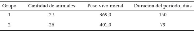 Animales. Se utilizaron 53 novillos Cebú y sus cruces F1 y F2 (Cebú x Holstein), divididos en dos grupos de ceba. El primer período de ceba, con 27 animales, comenzó en mayo, aunque los animales se fueron incorporando a la finca desde marzo hasta abril, y tuvieron un período de adaptación de 15-30 días, según la llegada de los diferentes lotes desde el mercado de subasta. El segundo grupo (26 animales) comenzó la incorporación entre el 15 y el 20 de octubre, con adaptación entre 10 y 15 días. El período de ceba comenzó el 1 de noviembre. Los pesos iniciales fueron de 369 y 401 kg para el primero y segundo grupo, respectivamente (tabla 2).