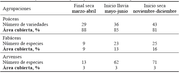 Hubo ligera tendencia a disminuir la cobertura de las poáceas (tabla 3), aunque se observó incremento sustancial de la cantidad de especies al final de la evaluación (43 especies), con la aparición de los géneros Andropogon, Axonopus, Cenchrus, Cynodon, Digitaria, entre otros.