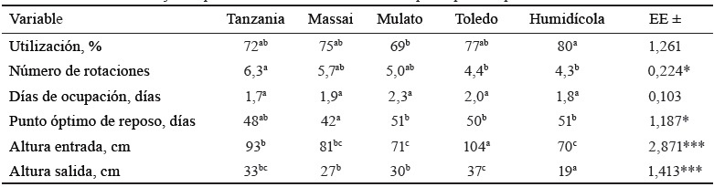 Indicadores del manejo. En la tabla 4 se observa el efecto del manejo del pastoreo rotacional Voisin en las principales especies estudiadas. El porcentaje de utilización del pasto fue alto (75,0 % como promedio), y no mostró diferencias significativas entre las especies estudiadas, lo que estuvo en concordancia con el tiempo de ocupación de los cuartones (entre 1,7 y 2,3 días) y el pastoreo profundo que los animales realizaron (se estimó que pastaron un horizonte de una profundidad que varió entre 41,0 y 67,0 cm). Esto indica que la intensidad de pastoreo fue bastante acertada, y que el consumo debió ser alto, a pesar de que el material residual también lo fue, ya que la altura del pasto a la salida de los animales de los cuartones varió entre 19,0 y 37,0 cm, con diferencias entre las diferentes variedades (p < 0,001).