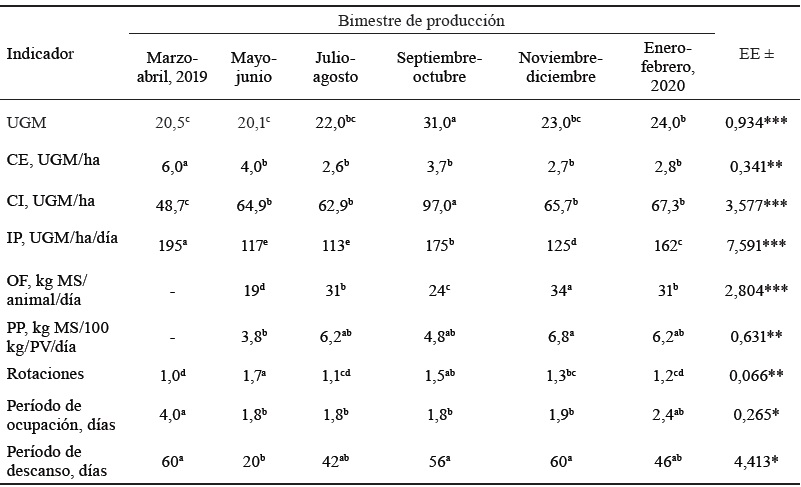 Los resultados por bimestre de los principales indicadores del manejo de los cuartones durante el período de investigación, que abarcó dos ciclos de ceba, se muestran en la tabla 5. Se observaron diferencias significativas entre todos los indicadores del manejo. En las UGM hubo diferencia (p < 0,001) con incremento progresivo, lo que se explica por el aumento de peso vivo de los animales a través de los bimestres, con excepción de mayo-junio, ya que los animales perdieron peso en abril durante la fase de adaptación al sistema (aproximadamente 11,0 kg) y, por ende, disminuyó la carga.