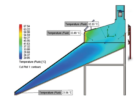 En la figura 2 se muestra la distribución de las temperaturas en el interior del secador para un corte transversal en el plano Y-Z. Se logró una temperatura homogénea en la sección de la cámara de secado, que superó la temperatura ambiente en 12, con una temperatura promedio de 32. Esto favorece el secado de las semillas, ya que la temperatura no sobrepasó los 45, cifra recomendada para el secado de las semillas.