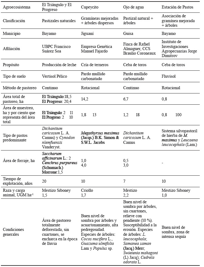 Localización. La investigación se desarrolló en cinco agroecosistemas de pastizales, en tres municipios de la provincia Granma, ubicada en la porción suroeste de la región oriental de la isla de Cuba.
