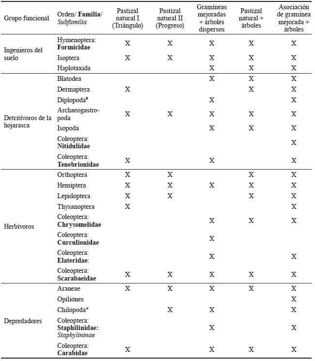 Se destaca el orden Coleoptera como el más diverso, en cuanto a grupos funcionales se refiere, pues se observó la presencia de ejemplares con hábitos detritívoros, herbívoros y depredadores. Díaz-Porres et al. (2014), en un estudio realizado para evaluar la relación entre los macroátropodos y la intensificación agropecuaria, que incluyó pastizales, obtuvo un resultado similar. Escobar-Montenegro et al. (2017) lo consideraron un indicador del grado de perturbación del suelo, pues tuvo mayor abundancia en el bosque latifoliado. Le siguió el sistema silvopastoril y, por último, el sistema del potrero tradicional estudiado. Los coleópteros realizan funciones ecológicas valiosas para el equilibrio de los agroecosistemas, pues son fundamentales al enterrar el estiércol y evitar que el ganado rechace el área de pastoreo que contiene bostas (Hernández-Chavez et al., 2020).