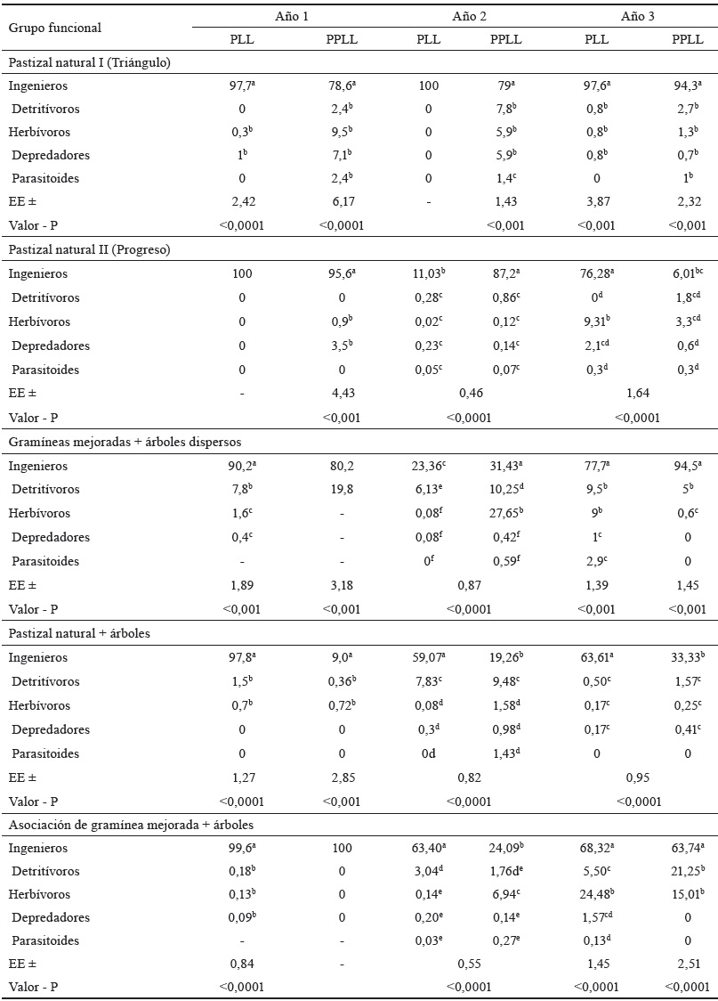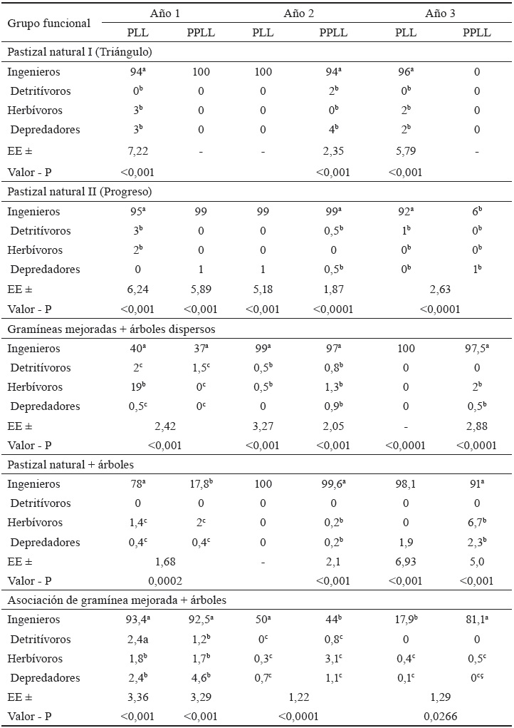 Hubo dominio absoluto en cuanto a la abundancia proporcional de los ingenieros del suelo en los cinco agroecosistemas estudiados en todos los períodos de muestreo (tablas 3 y 4), en ambos métodos de muestreo utilizados (con excepción del PPLL de tercer año de muestreo en el pastizal natural I, donde no hubo individuos). El resto de los grupos funcionales estuvo menos representado, generalmente por debajo de 10 %, con excepción de los herbívoros en Cupeycito, en el período lluvioso del primer año, donde su abundancia fue de 31 % y de los depredadores en El Progreso, en el período poco lluvioso del tercer año, que exhibieron abundancia proporcional de 20 %, ambos casos por el método de los monolitos.