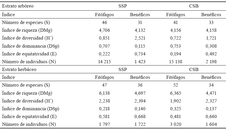 De manera general, como resultado del cálculo de los índices ecológicos referidos a la comunidad de insectos de acuerdo con su función biológica, en ambos agroecosistemas (SSP y CSB) se constataron valores similares en el estrato arbóreo como en el herbáceo (tabla 1).