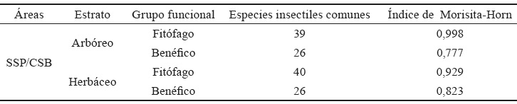Con relación a la similitud entre las comunidades de especies insectiles existentes en el SSP y el CSB, según los estratos, los grupos funcionales y el total de especies de insectos que se detectaron en cada caso se muestran en la tabla 1. Como resultado del cálculo del índice de Morisita-Horn (tabla 2), se pudo ver que, en ambas áreas, hubo semejanza evidente (aunque no completa) entre los fitófagos y los benéficos, en el estrato arbóreo como en el herbáceo, pues el valor fue superior a 0,7 en todos los casos, con ligera superioridad para los fitófagos. Ello indica que hubo más de 70 % de coincidencia entre las especies insectiles que se capturaron (de 77 a 99 %), de acuerdo con el criterio de Pérez y Sola (1993).