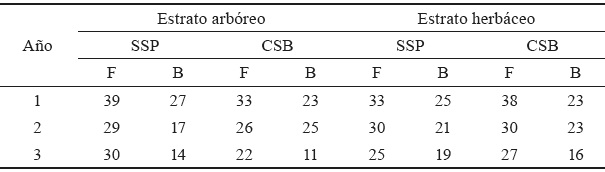 Esto significa que a pesar de que cada área tuvo un destino productivo y un manejo de la plantación diferente, esta condición no influyó en que se encontraran diferencias notables entre las especies recolectadas. No obstante, hubo una tendencia decreciente del número de especies insectiles, observada de un año a otro, en los dos estratos de cada área (tabla 3), excepto los fitófagos en el tercer año en el SSP y los benéficos en el segundo año en el CSB, que aumentaron ligeramente en el estrato arbóreo, y los benéficos en el año 2 en el CSB, que se mantuvieron en igual cantidad en el estrato herbáceo. Por ello, se precisa realizar un manejo adecuado de dichas asociaciones, según su fin productivo.