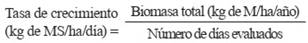 Tasa de crecimiento: La tasa de crecimiento se calculó con relación a la biomasa obtenida durante el período de evaluación, de acuerdo con la fórmula: