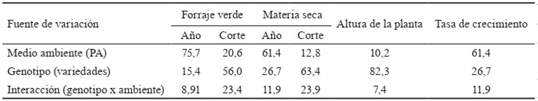 Efecto de la variabilidad entre el genotipo y el ambiente. Se determinó la variabilidad para la producción de FV, MS, tasa de crecimiento y altura de la planta (tabla 2). En la variabilidad para la producción de FV anual, 76 % correspondió al medio ambiente o PA, 15 % a las variedades (genotipo) y 9 % a la interacción entre las variedades con los PA. Esto resultó determinante para explicar que las variedades de M. sativa lograron diferentes resultados para el número de cortes. En el PA I se obtuvo mayor número de cosechas, lo que demostró la superioridad del PA I (2 300-2 800 msnm).