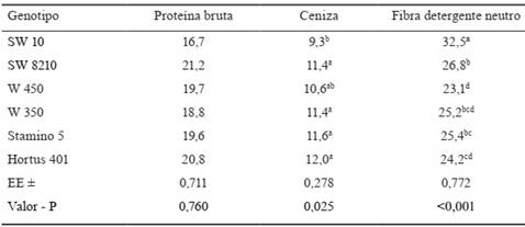 Composición química. Los contenidos de PB entre los cultivares fueron similares, y estuvieron entre 16,7 y 21,2 %. Estos resultados son muy aceptables para la alimentación del ganado lechero en la zona altoandina. No obstante, fueron inferiores a los reportes de Capacho-Mogollón et al. (2018), Contreras et al. (2019) e Ison et al. (2020), y se asemejan a lo obtenido por Alonzo Griffith y Paniagua Alcaraz (2010), quienes encontraron valores de 20,0 % con diferentes dosis de calcáreo en los suelos. La concentración más baja de ceniza correspondió al cultivar SW 10. La FDN varió de 23,1 a 32,5 %. El mayor contenido (p < 0,001) correspondió a la variedad SW 10. Por el contrario, las variedades que aportaron la menor concentración de FDN fueron W 450, Hortus 401 y W 350.