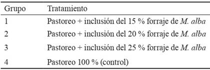 El alimento se suministró a razón de 0,30 de M. alba kg/animal/día para 15 %; 0,40 kg/animal/día para 20 % y 0,51 kg/animal/día para 25 %. El agua se suministró a voluntad.