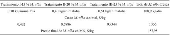Es viable económicamente la inclusión de M. alba como suplementación durante la etapa experimental, con valor ($ kg) de 0,18 en moneda nacional (MN), según los precios internacionales, aunque M. alba presenta un costo adicional en divisas de 0,37 USD/ kg (Alpízar, 2014). Los costos de producción de los diferentes niveles de inclusión de M. alba en kilogramos ofrecidos durante el experimento dependieron, en lo fundamental, de la utilización de la fuerza de trabajo, de los componentes agronómicos, del corte y el acarreo (Herrera, 2010). Se valoró la GMD y el peso final en comparación con el grupo control y el precio del ovino en el mercado cubano (tabla 4).