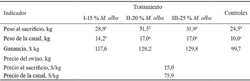 M. alba tuvo un costo en MN de 23,7 ($ kg) durante los tres meses del experimento. La tabla 5 muestra la ganancia de peso al sacrificio y el peso de la canal, en correspondencia con el precio del ovino en el mercado nacional. Los grupos experimentales mostraron diferencias significativas en los tratamientos II y III con respecto al control.