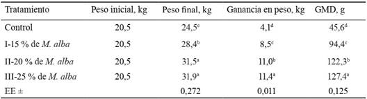 En la tabla 3 se muestra el peso inicial y final, así como la GMD de los animales con las diferentes inclusiones de M. alba. En los tratamientos II y III se alcanzaron los mayores valores para el peso final, sin diferencias significativas entre ellos, pero sí con respecto al tratamiento I y al control.