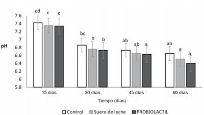 El ensilaje no inoculado (control) condujo a un lento descenso en el pH, que solo presentó diferencias con respecto al primer muestreo a partir del día 45. Los tratamientos inoculados con las BAL mostraron un declive desde los 30 días. A partir de este tiempo, el pH se mantuvo estable para el inóculo con suero de leche. Sin embargo, PROBIOLACTIL® continuó descendiendo hasta los 45 días. Los pH finales, si bien no difirieron entre ellos, presentaron cifras de 6,6 (control); 6,5 (suero de leche) y 6,4 (PROBIOLACTIL®), valores que, de acuerdo con los criterios de calidad establecidos para los ensilajes tropicales, resultan inadecuados (Demanet-Filippi, 2017).