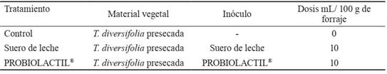 Materiales y Métodos: El forraje de T. diversifolia, con 90 días de rebrote, se obtuvo de una parcela fertilizada con 20 t de materia orgánica/ha. La colecta fue manual y las plantas se procesaron en una troceadora estacionaria (1-2 cm). Se sometieron a presecado, bajo techo, durante 24 horas. Los tratamientos fueron: a) T. diversifolia sin inóculo, b) T. diversifolia con suero de leche y c) T. diversifolia con PROBIOLACTIL®. Las evaluaciones se efectuaron a los 15, 30, 45 y 60 días de conservación. Los inóculos tuvieron una concentración de bacterias lácticas, UFC mL-1, de 106 para el suero de leche y de 109 para el PROBIOLACTIL®. Se evaluaron los indicadores materia seca, pH, proteína soluble, conteo de bacterias ácido lácticas e indicadores organolépticos (olor, color, textura y humedad). Los datos se procesaron mediante un análisis de varianza simple y la diferencia entre medias según Duncan, con el programa Statgraphic Plus, versión 5.0.
