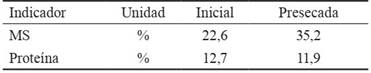 El contenido de MS del forraje es el indicador más importante que se debe considerar antes de iniciar el proceso de ensilaje. Su valor óptimo debe variar entre 30 y 35 %, para lograr una fermentación adecuada y minimizar las pérdidas del producto final. Según plantea Sánchez-Ledezma (2018), cuando los forrajes a ensilar no cumplan este requisito, se recomienda un presecado antes de confeccionarlos. En esta investigación, el forraje de T. diversifolia mostró valores iniciales de MS y proteína, similares a los que encontraron Londoño et al. (2019). Sin embargo, en la tabla 2 se muestra la modificación de estos valores por el efecto del presecado.
