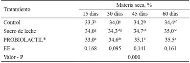 En el proceso de conservación, a partir de los 15 días, la MS mostró tendencia a aumentar en los tres ensilajes (tabla 3). Se presentó interacción significativa (p ˂ 0,05) entre el tiempo y los tratamientos. El control manifestó cifras inferiores con respecto a los tratamientos inoculados. De ellos, PROBIOLACTIL® mostró el mayor porcentaje. A pesar de haber diferencias entre los ensilajes que utilizaron aditivos microbianos, a los 60 días ambos mostraron valores superiores o iguales a 35 %. No obstante, la MS del ensilado sin inocular (control) resultó por debajo de este valor.