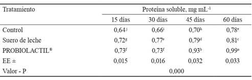 En la tabla 4 se muestra el contenido de proteína soluble, cuando se presentó interacción significativa (p < 0,05) entre los tratamientos y el tiempo de conservación. Se hallaron los mayores valores en los ensilajes, en los que se inocularon BAL. De ellos, el ensilado tratado con PROBIOLACTIL® no presentó diferencias entre los tiempos de 15 y 30 días, pero sí entre 45 y 60, siendo este último el de mayor valor (0,99 mg mL-1). Este resultado puede obedecer al efecto de las BAL en los ensilados.